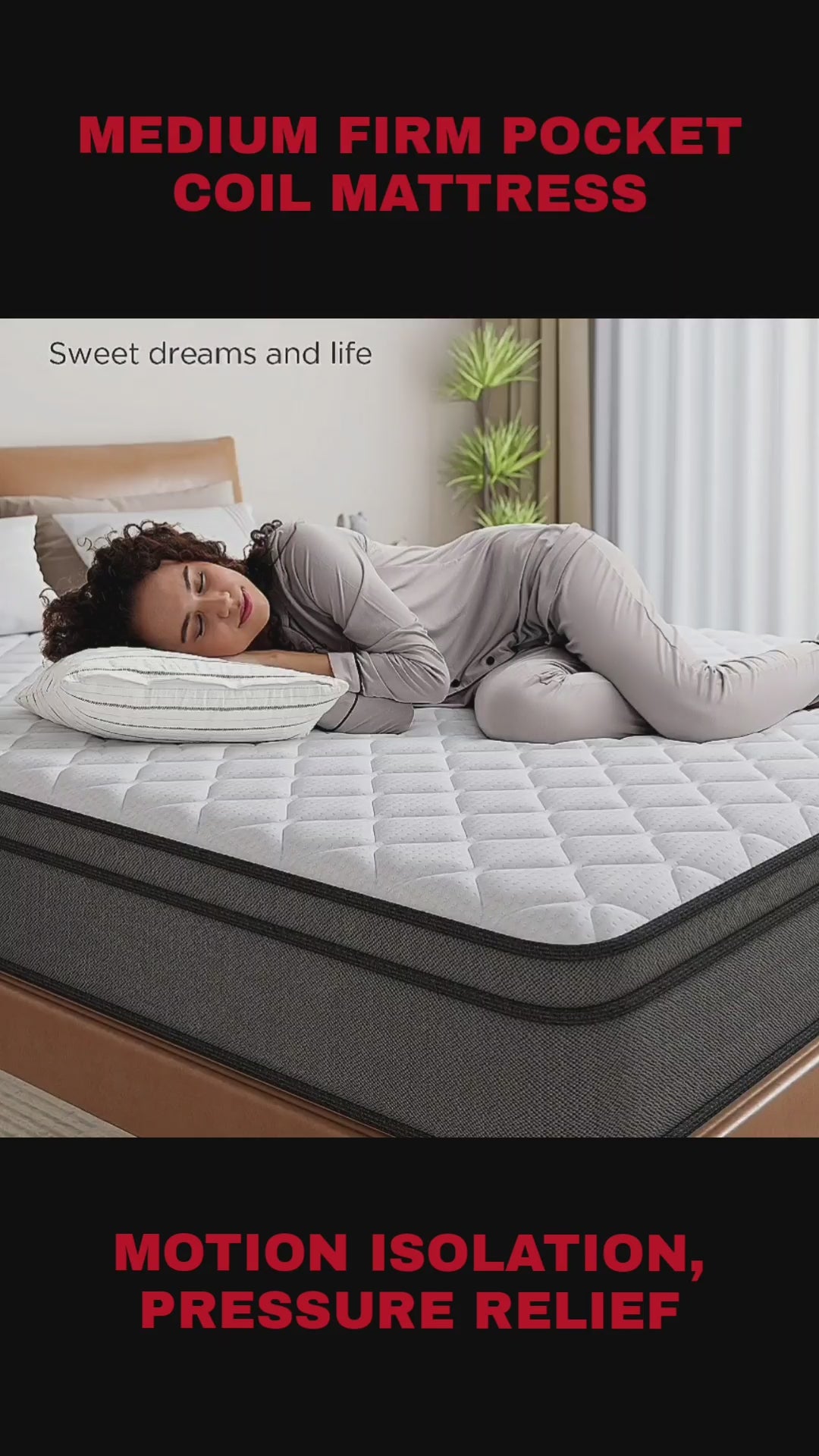 Medium Firm Pocket Coil Mattress: Motion Isolation, Pressure Relief. Queen (8”)/Full (6”). Comfort for all sleep positions.