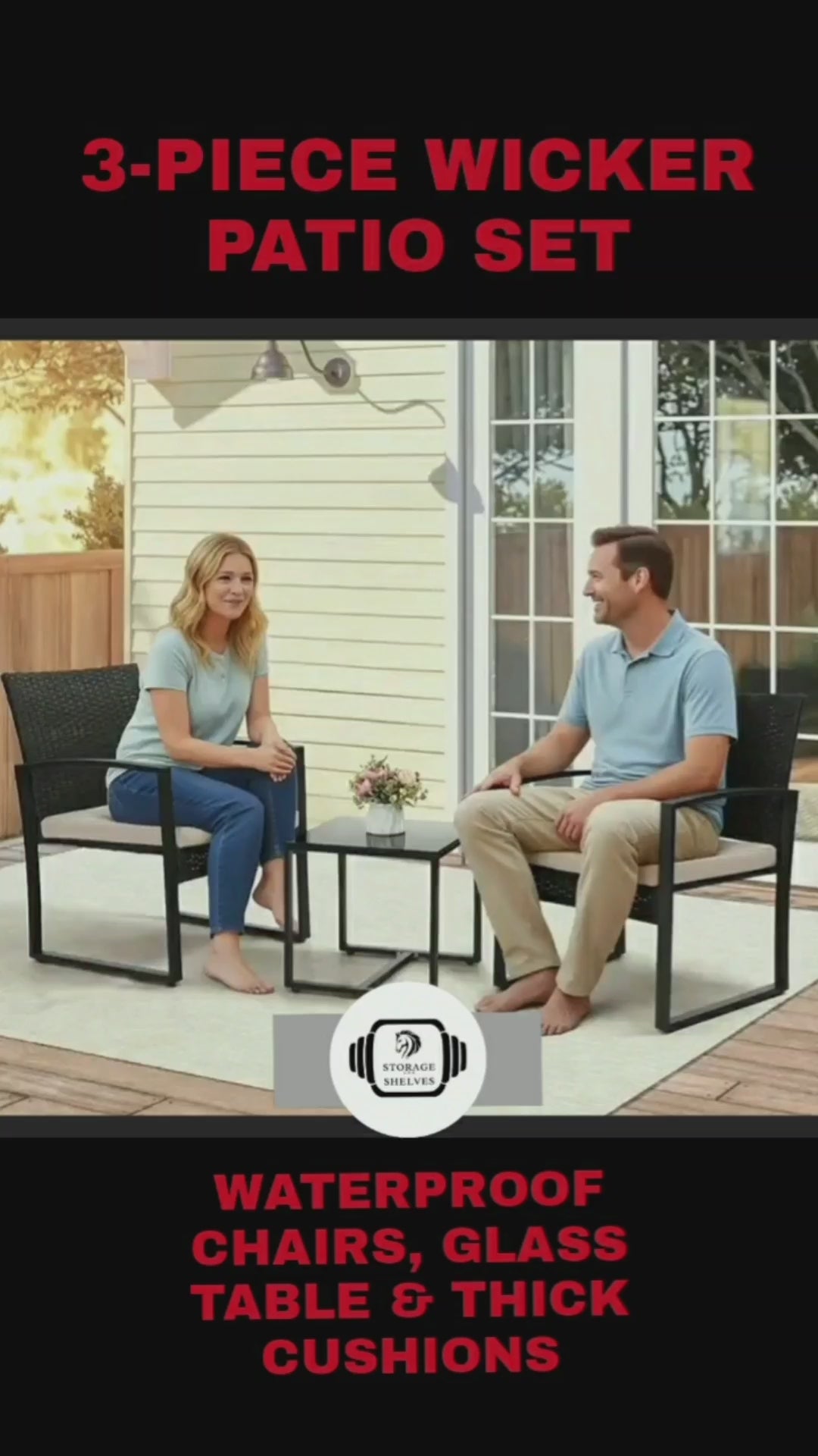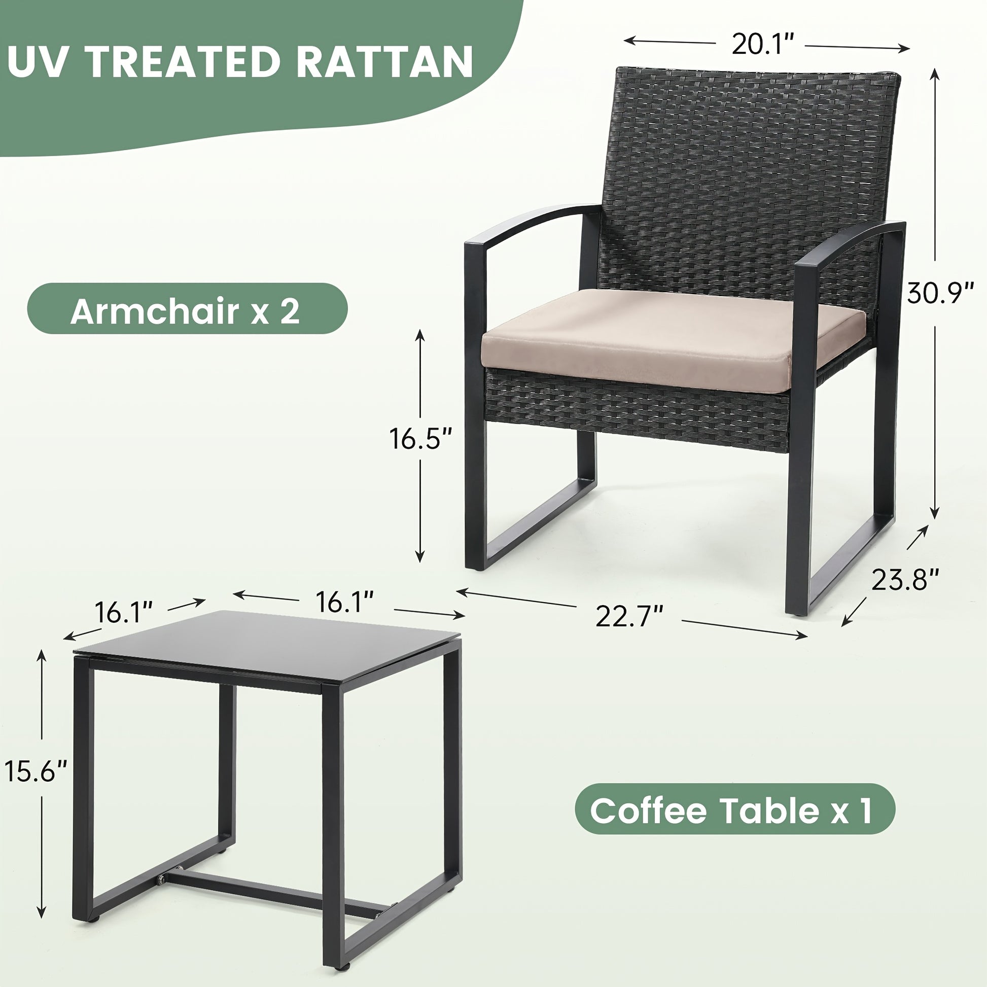 3-Piece Wicker Patio Set: Waterproof chairs, glass table & thick cushions. Perfect for garden & deck| 50% OFF